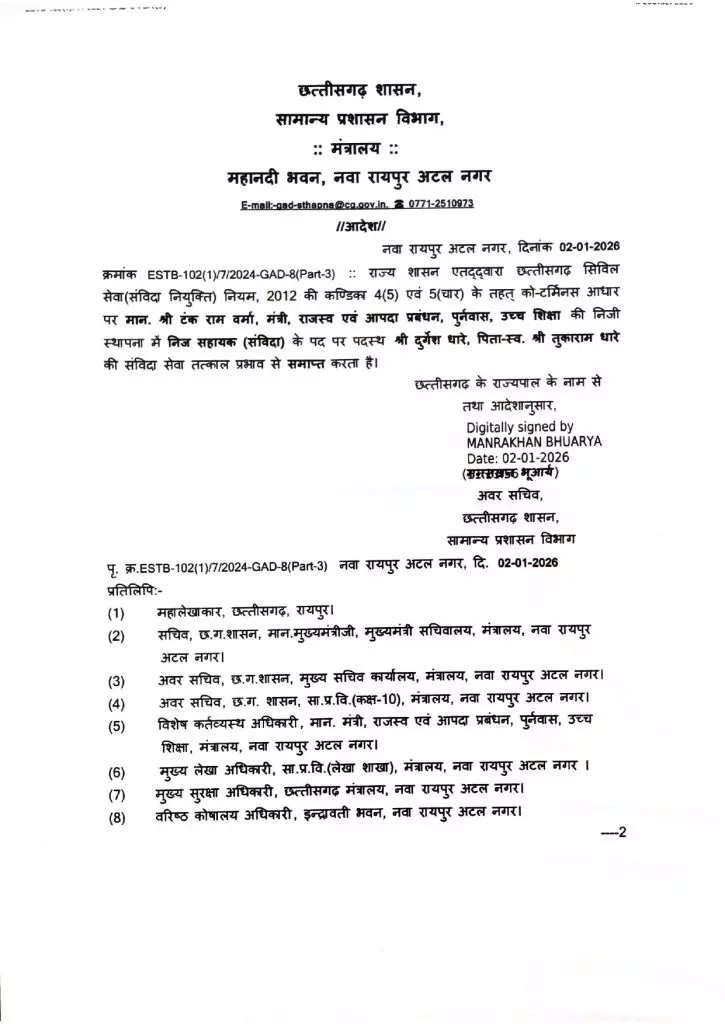 रायपुर । छत्तीसगढ़ शासन ने राजस्व मंत्री टंकराम वर्मा की निजी स्थापना में बड़ा प्रशासनिक बदलाव किया है। सामान्य प्रशासन विभाग (GAD) ने एक कड़ा आदेश जारी करते हुए मंत्री के निज सहायक (PA) दुर्गेश धारे को तत्काल प्रभाव से पदमुक्त कर दिया है। सामान्य प्रशासन विभाग के अवर सचिव मनराखन भुआर्य के हस्ताक्षर से जारी इस आदेश ने मंत्रालय गलियारों में चर्चाएं तेज कर दी हैं।