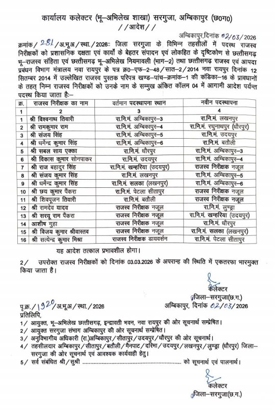 जारी आदेश में उल्लेख किया गया है कि, जिला सरगुजा के विभिन्न तहसीलों में पदस्थ राजस्व निरीक्षकों की प्रशासनिक कसावट एवं कार्यों के बेहतर संपादन एवं लोकहित की दृष्टि से राजस्व निरीक्षकों का स्थानांतरण कर नवीन पदस्थापना सूची जारी किया गया है। राजस्व निरीक्षकों को दिनांक 03.03.2026 को अपराह्न की स्थिति में कार्यभार ग्रहण करना सुनिश्चित किया जाता है।”